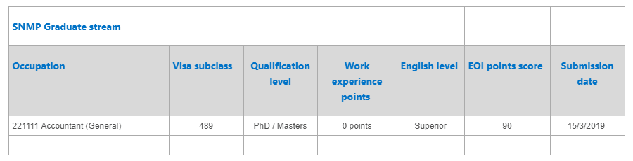 只有一个高分职业——会计。489州担保获邀,分数是90分。博士/硕士研究生学历,没有工作经验加分,英文4个8。递交时间2019年3月15日。