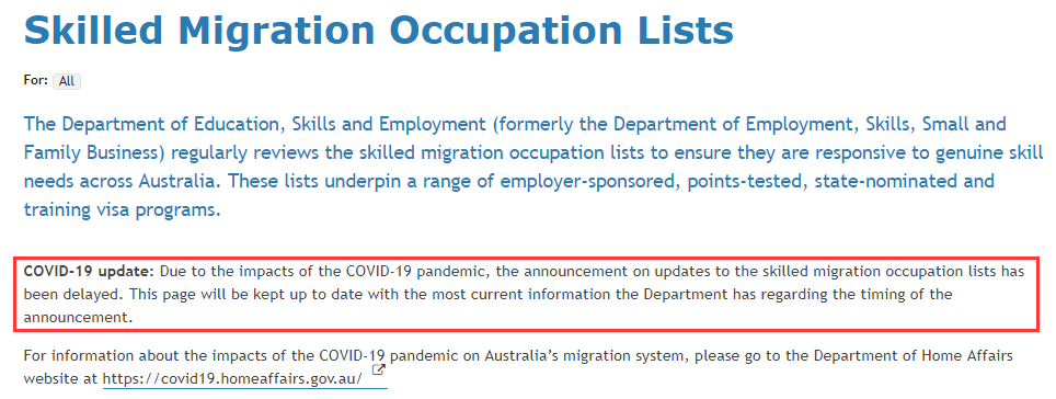今日,澳大利亚Department of Employment, Skills, Small and Family Business发布通知:由于新冠疫情的影响,技术移民职业清单将推迟公布!