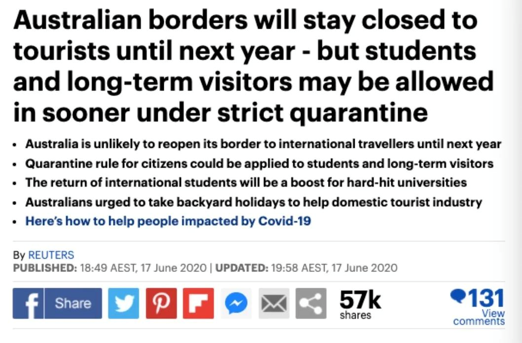 据最新消息报道:澳洲边境可能要关闭到明年,但是留学生和长期访客除外,可能很快可以入境。