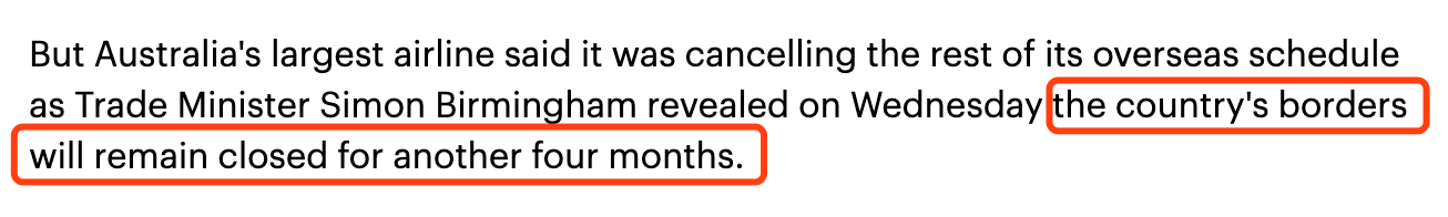 该航空公司的一位发言人说,由于澳大利亚边境将关闭一段时间,因此取消了大多数国际航班,直到10月下旬。