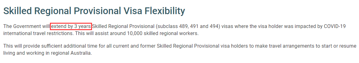 •如果签证持有人受到COVID-19国际旅行限制的影响,其489/491/494签证将会自动延期3年。