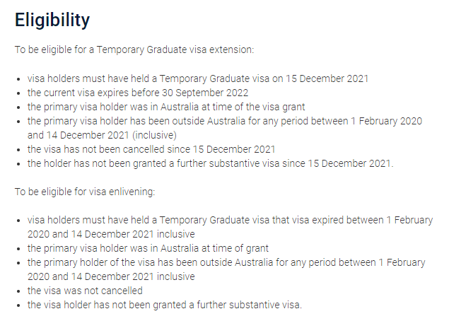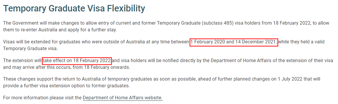 •在2020年2月1日~ 2021年12月14日期间在澳洲境外的持有有效临时毕业生签证的毕业生,其签证将获得延期,并将于2022年2月18日生效,签证持有人将由内政部直接通知他们的签证延期,获得延期后就可以返回澳洲。