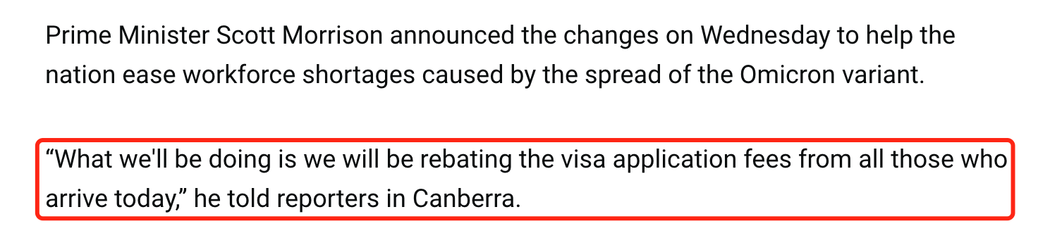 除此之外,莫里森总理还在今日的新闻发布会上宣布:从今天起抵达澳大利亚的国际学生和打工度假签证持有人的签证申请费将得到返还。希望通过这个措施鼓励更多海外人士入境澳大利亚来缓解目前境内劳动力短缺的问题。