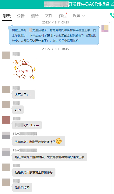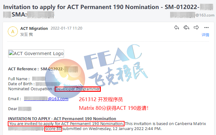 1月12日ACT开放海外申请,飞克移民第一时间帮客户递交,1月17日成功获邀!帮助客户成为2022年ACT 190首批获邀者!客户对飞克的专业表示非常满意!