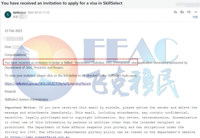 该客户于2022年8月19日递交维州190EOI,EOI分数: 80分(含190州担保5分),2023年1月24日预获邀;2023.1.30递交提名,2023.2.23提名正式获邀。