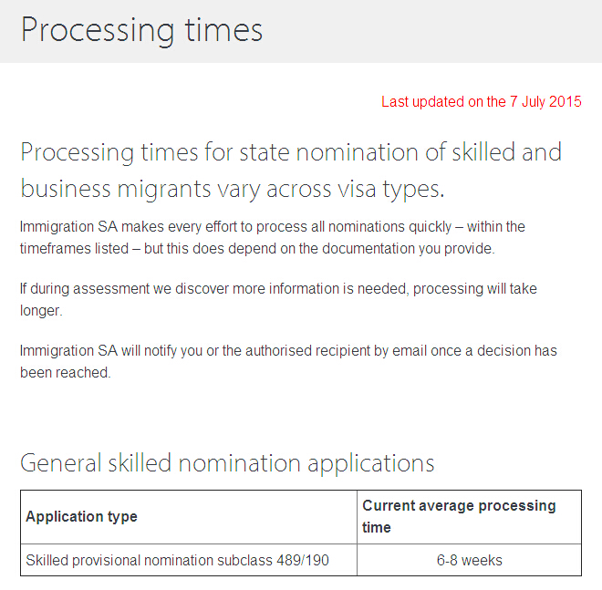 7月7日,南澳(SA)公布了对190/489两类移民申请材料的审理时间为6-8周左右。