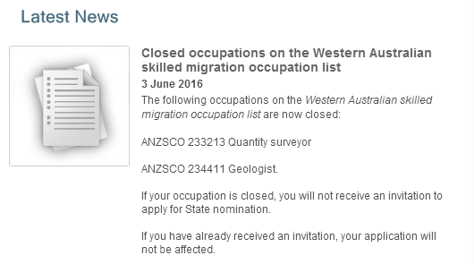 6月3日西澳移民官网发出通知:ANZSCO 233213 Quantity surveyor,ANZSCO 234411 Geologist.