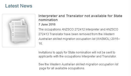 ANZSCO 272413 笔译和272412 口译已经从西澳大利亚技术移民2015–16职业列表中移除(wasmol)。申请这两个职业的州担保将不会收到邀请。