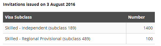 移民局今日发布了8月3日EOI邀请结果数据。该轮邀请189配额邀请了1400个,Skilled - Regional Provisional (subclass 489)亲属边远地区担保邀请了100个。