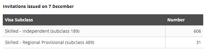 今日移民局发布了12月7日EOI邀请的官方结果报告。个别职业名额剩余不多,邀请数量只能降低,该轮邀请189配额邀请了606个,(subclass 489)亲属边远地区担保邀请了31个。