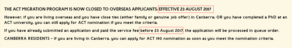 据最新消息,从2017年8月23开始,堪培拉政府针对海外申请者关闭州担保申请(有堪培拉亲属,真实工作offer,或者此前是堪培拉PhD毕业生不受影响)。