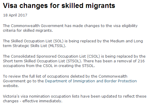 此次改革也将移民职业列表更换,从2017年4月19日起,SOL变为MLTSSL(Medium and Long-term Strategic Skills List ),CSOL变为STSOL(Short-term Skilled Occupation List),其中216种职业从清单移除,另有59种职业被新加进来。(具体清单请点击上面蓝色文字链接)