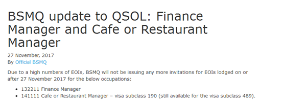 昆州官网宣布:由于申请人数众多,2017年11月27日之后昆州将不再发放以下职业EOI邀请: