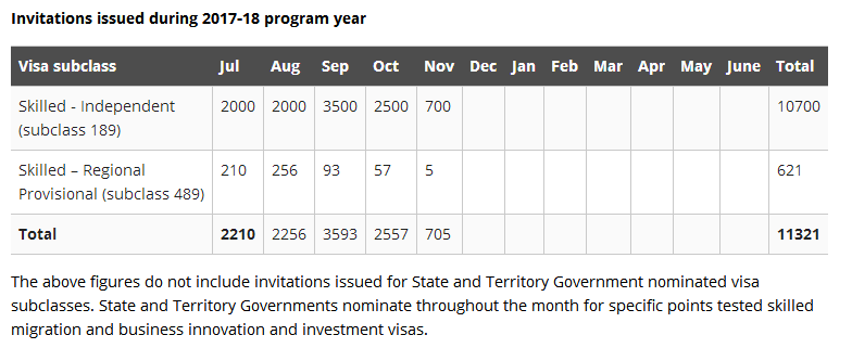 2017-18年度截至本轮:189独立技术移民共邀请了10700人,489偏远地区亲属担保为621人。