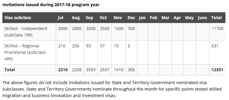 2017-18年度截至本轮:189独立技术移民共邀请了11700人,489偏远地区亲属担保为631人。