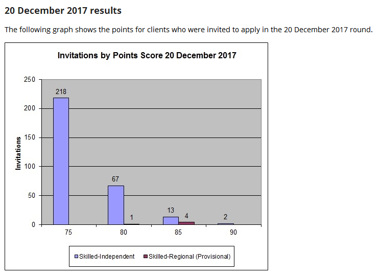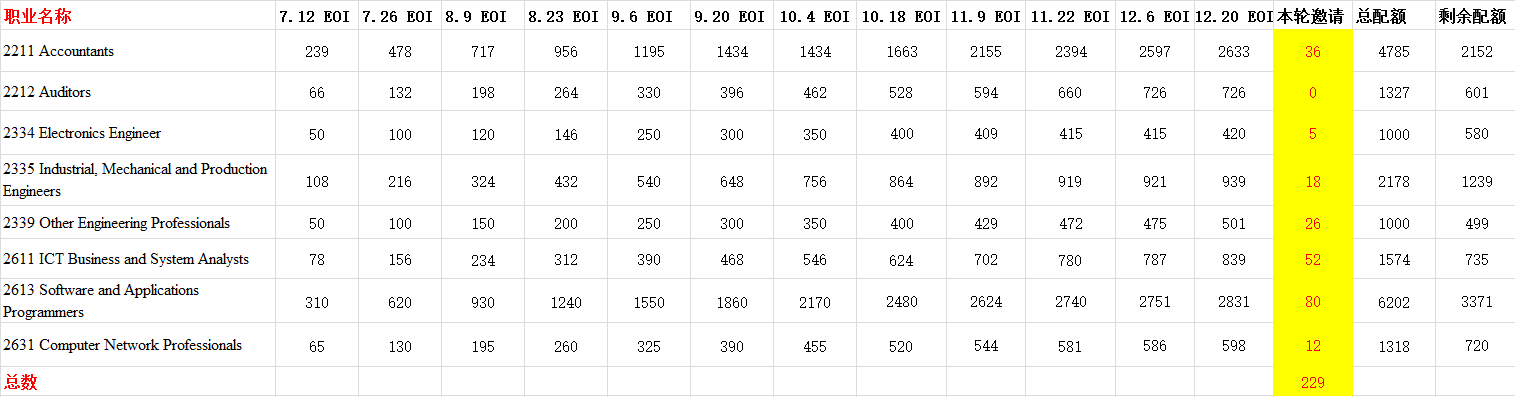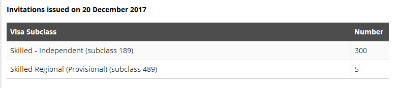 今日,移民局更新了2017年12月20日的EOI邀请官方报告,这也是2018年第一次更新EOI邀请的官方数据。然而,该轮189独立技术移民的邀请人数依旧仅有300人, 489偏远地区亲属担保仅有5人。 以下是官网数据↓↓↓