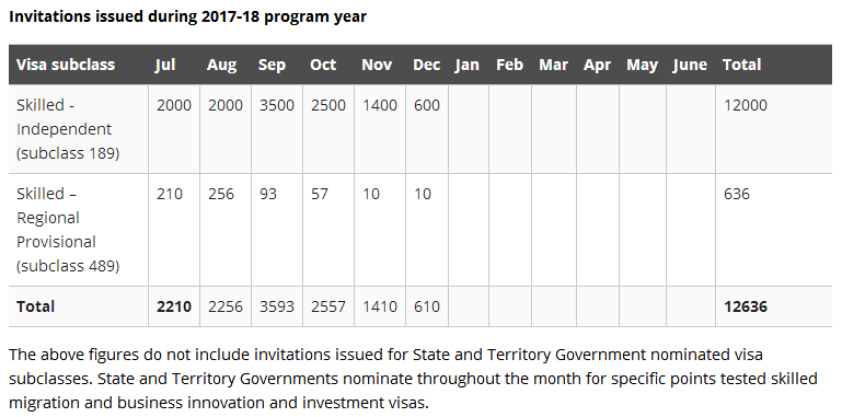 2017-18年度截至本轮:189独立技术移民共邀请了12000人,489偏远地区亲属担保为636人。