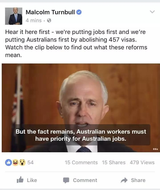 重磅突发!就在中午!澳洲总理在自己的facebook主页上发布通知:澳洲政府要废除457雇主担保签证!