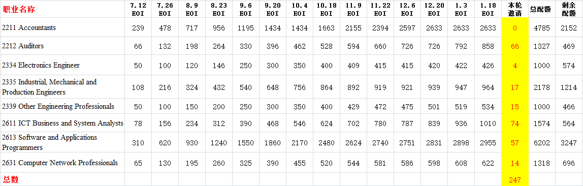 本轮邀请获邀的主流分数还是75分,个别热门职业如会计没有发放邀请,其他职业获邀分数时涨时落。配额方面,本轮大多数热门职业并没有按照pro rata标准发放,冷门专业也只邀请了70分以上的申请,本财年所剩的配额还很多,预计后面几个月有很大希望会增加发放邀请的数量,我们一起拭目以待吧!