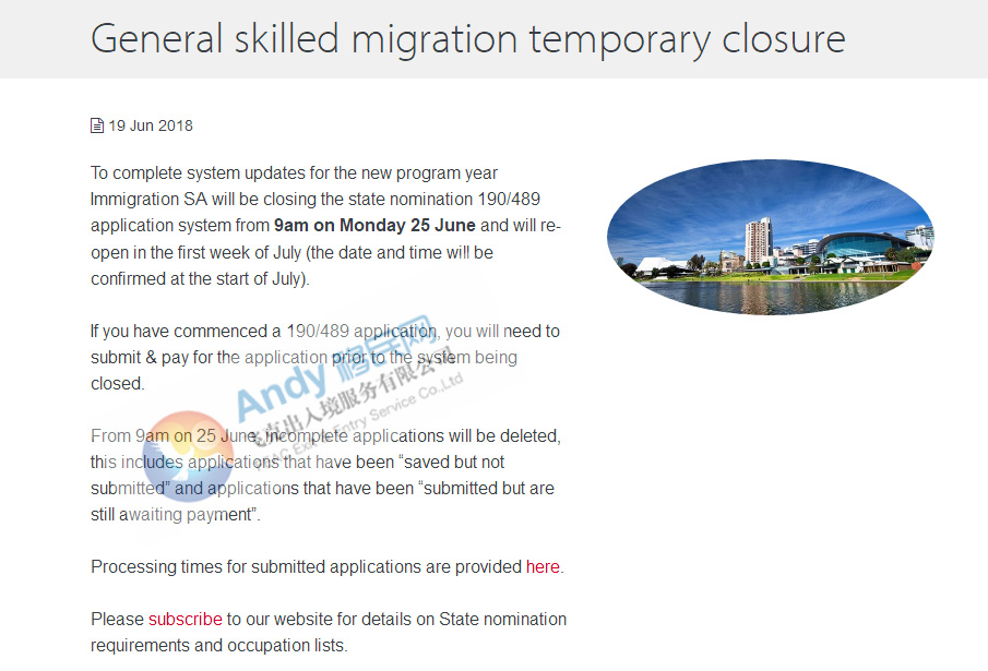 今日,南澳州政府在其官网发布通知称:为迎接新财年,南澳政府将升级申请系统,6月25日早上9点起将关闭190和489州政府提名,7月第1周再开放申请,但具体日期等待通知。