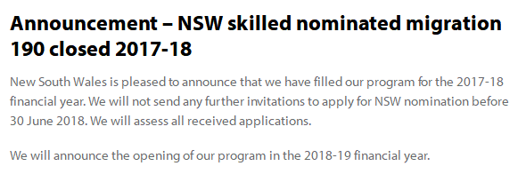 上周,新州就宣布本财年190州担保名额已经满额,不再发放新的邀请,已经递交的申请仍会正常审理。