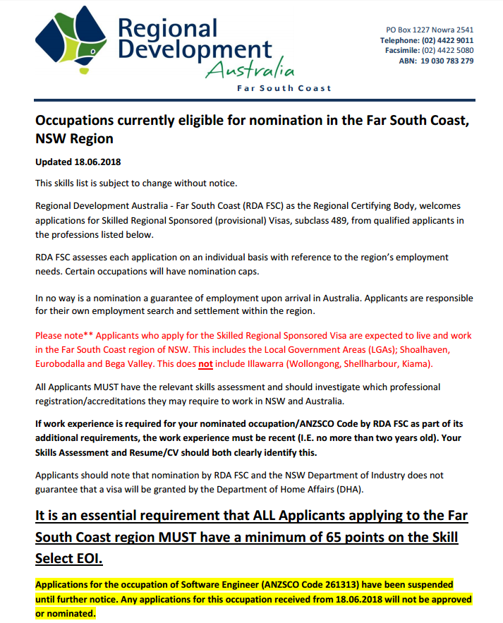 489签证方面,Far South Coast地区6月18日宣布要求EOI最低65分,261313软件工程师从前日18号起已暂停发放邀请,其他职业仍可正常申请。