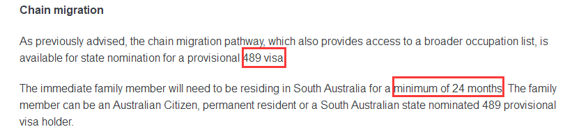 值得注意的是,直系亲属需要在南澳大利亚居住至少24个月(原来是12个月,增加了1年)。不过直系亲属除了可以是澳大利亚公民Citizen和永久居民PR以外,还新增了489签证持有者。