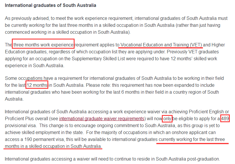 雅思4个7或总分7.5豁免工作经验要求, 只能申请489签证(以前可以申请190签证) 但是3个月南澳工作经验依旧可以直接申请190签证。