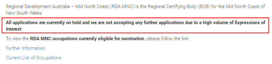 由于申请人数较多,Mid North Coast又暂停了所有职业的担保,暂不接受新的申请。