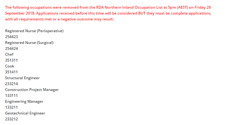 Northern Inland职业列表会根据地方经济和职业申请情况经常调整,一旦达到所需数量就会剔除职业或暂停接受州担保申请,2018-19财年至今四个月的时间职业已经变动过多次。