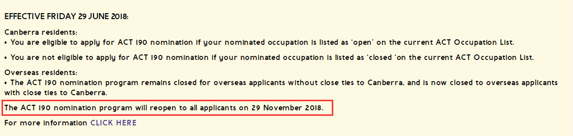 关闭4个多月,移民朋友终于在今日等来了ACT堪培拉政府的官宣:11月29日将重新开放ACT 190州担保申请!