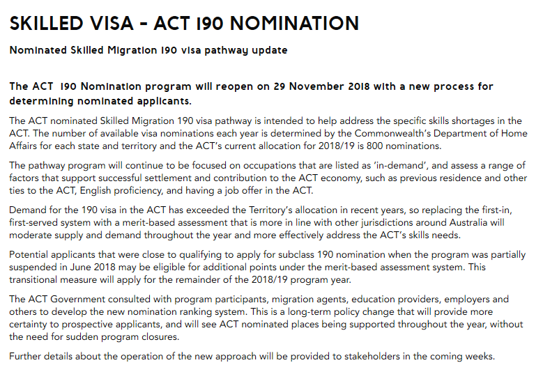 今日,ACT堪培拉政府宣布:本月底11月29日将重新开放190州担保申请,配额估计还是800个,或将采用新的邀请和审理方式。