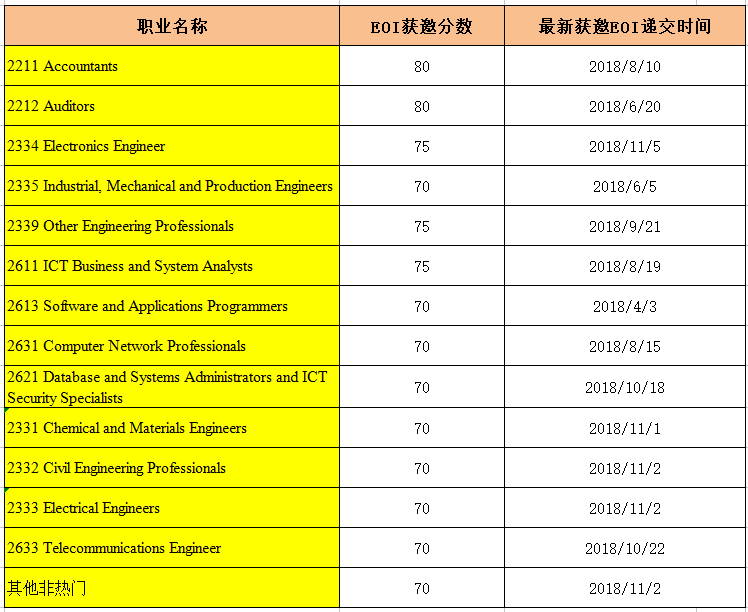 本轮依旧发放了大量70分的邀请,邀请总数应该还是维持在2500个左右。会计、审计85分可以秒邀,而80分等待时间缩短,本轮推进速度和前几轮差不多;IT方面除2611 75分外其他70分可获邀;三大热门工程主要还是集中在75分获邀,机械工程继续维持70分获邀,推进了2个多月,其他工程类职业如化学、土木、电气等70分已邀请至11月,邀请速度非常快;非热门职业本轮继续前行2个月,如果按此进度的话,下轮有希望邀请完全部的70分申请者。