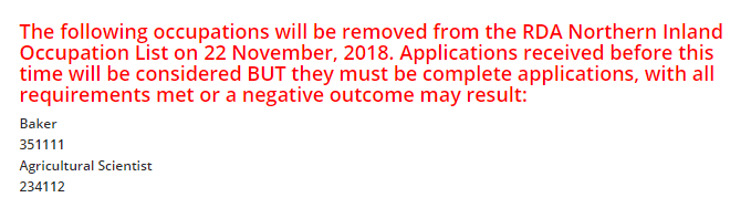 新州Northern Inland以下2个职业11月22日将删除,请打算申请新州Northern Inland 489担保,职业代码为 351111 面包师和234112 农业科学家的申请人尽早递交申请。
