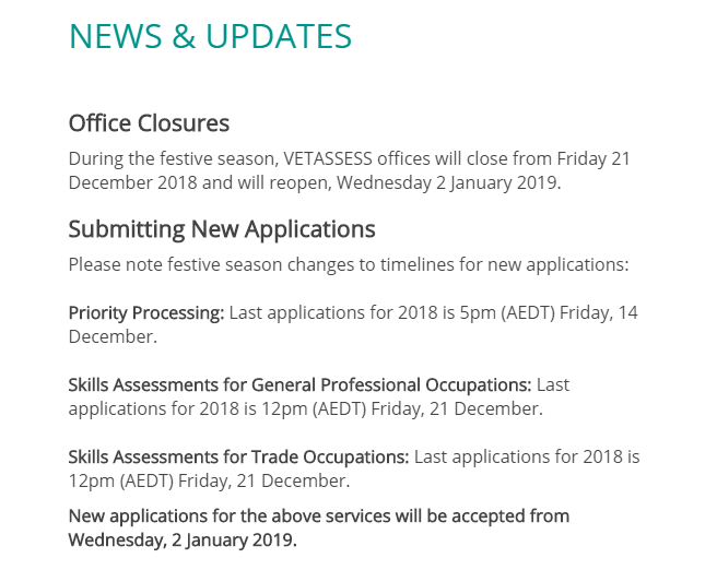 放假期间VETASSESS将暂停工作,请大家注意各类别的截止时间,如果错过需要等到2019年1月2日才能接受新递交的申请。
