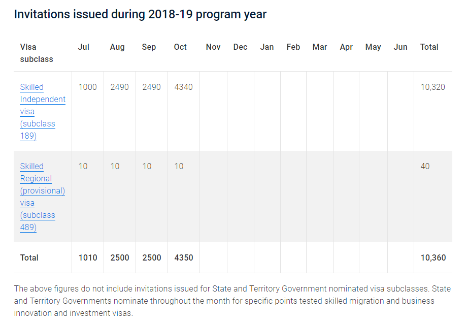 2018-19年度截至本轮:189独立技术移民共邀请了10320人,489偏远地区亲属担保为40人。