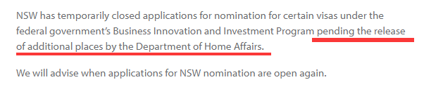 新州这次的暂时关闭着实有些突然,目前维州、南澳等其他州担保还未受到影响,但不保证后面不会突然关闭。小编还记得2018年1月底的时候,南澳就曾关闭过投资移民,想想也就是上个财年过到一半的时候关闭的,本财年新州也是如此。