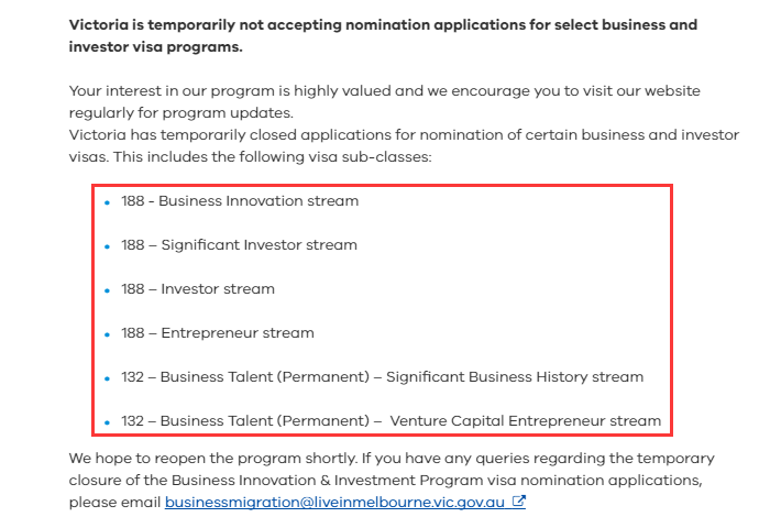 维州关闭商业移民,下列签证类别暂不接受申请。