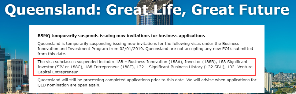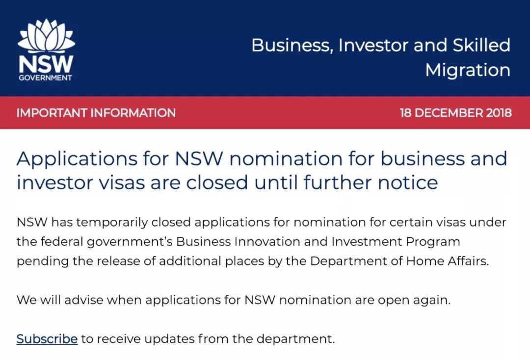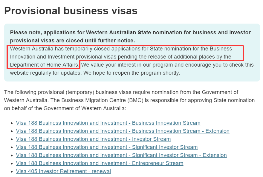 西澳政府官网通知:由于配额用完,暂时关闭商业创新和投资者等188签证,等后期内政部补发配额再开放申请通道。