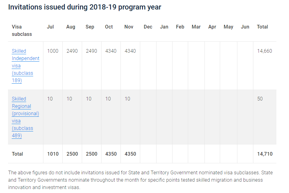 2018-19年度截至本轮:189独立技术移民共邀请了14660人,接近上财年整年的邀请量15600个;489偏远地区亲属担保共邀请50人。