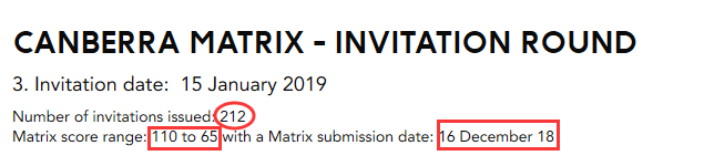 本轮邀请的最低分是65分,最高分是110分,已经邀至2018年12月16日递交的申请。正如小编的预测,本轮分数略有降低。Canberra Matrix目前共邀了3轮,此轮邀请分数比首轮降了20分,分数逐步降低,这对申请人来说无疑是个好消息,Matrix打分60分的申请人应该还是有希望的。