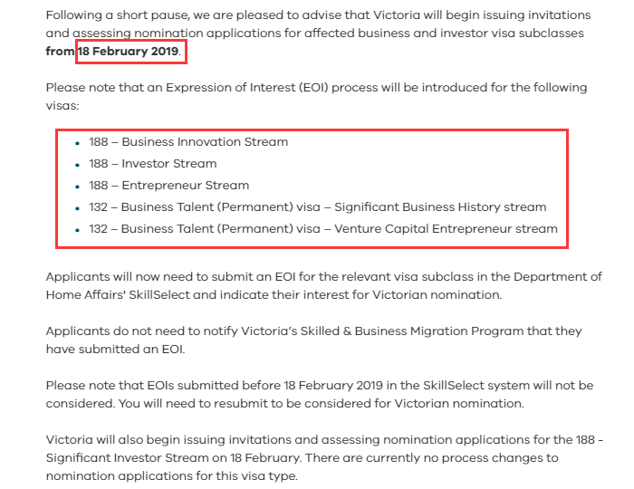 在2019年2月18日之前递交的EOI,维州政府不会考虑。你需要在这个日期及之后重新递交EOI!更多详情请咨询飞克团队。