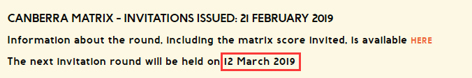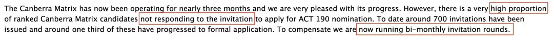 Canberra Matrix系统目前已经运作了将近3个月,发放了5轮约700个邀请,其中只有三分之一正式获邀,大部分没有回应。作为对其他没受到邀请的申请人一个补偿,ACT州政府决定将邀请轮次改为每月两次!