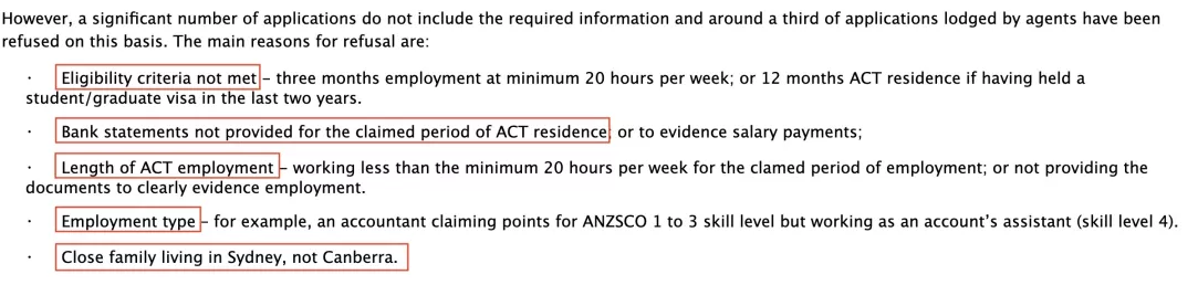 • 不符合申请资格基本要求:三个月内每周至少工作20小时;如果在过去两年持有学生/毕业生签证,需要在ACT居住满12个月;