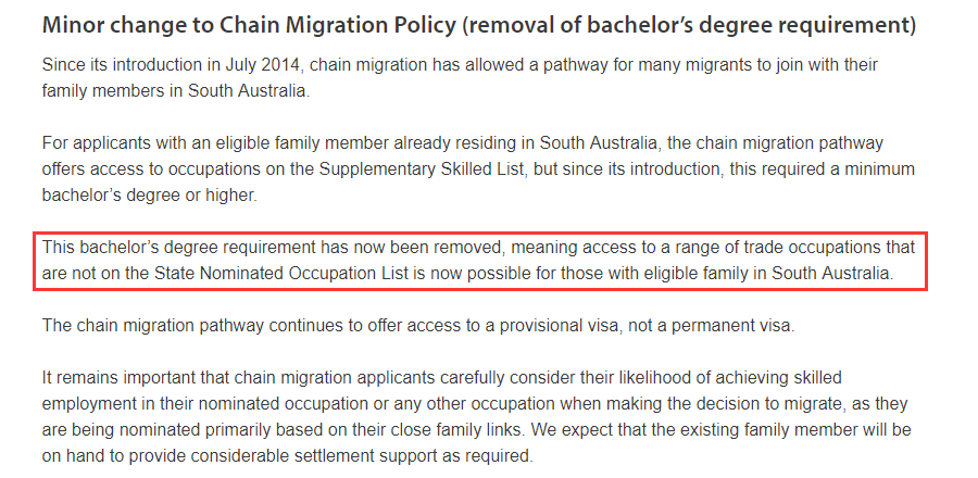 之前的亲属担保要求申请者至少有本科以上的学历。本次调整之后,取消了学历要求,这将大大利好于那些Tafe毕业的学生。因为这意味着申请人终于有资格申请南澳SNOL清单外的大量trade 职业。只要有亲属在南澳居住,就可以通过亲属担保移民来澳与家人团聚。