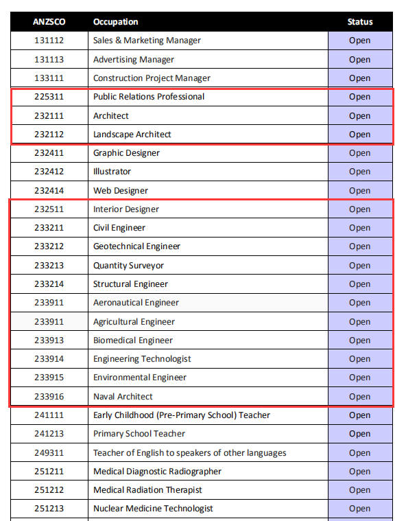 Open列表职业比较稳定,我们常见的公共关系专员、建筑师、土木、岩土、结构、航空、农业、生物医学、环境、造船工程师和工程技师等热门职业依旧还保留在Open列表,可以继续申请ACT 190担保。