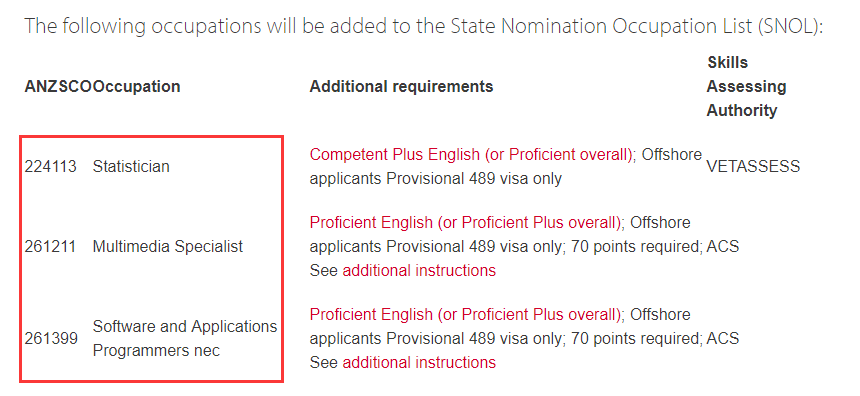 261399其他软件和应用程序员:要求英语达到雅思每个单项7分或总分7.5分;海外人士只能申请489州担保;这个职业要求EOI分数70分,也就是说海外申请人需要自身EOI达到60分才能申请南澳489担保(489担保可为申请人加10分即可达到EOI70分的要求);