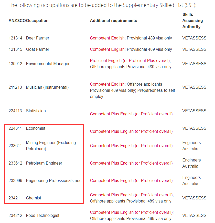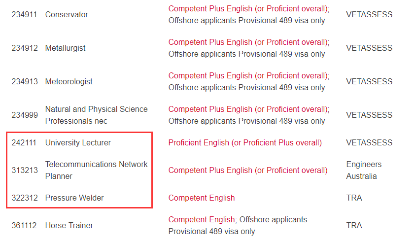 与移民局职业调整保持一致,经济学家、采矿工程师、石油工程师、其他工程专业人员、大学讲师、电信网络规划师、压力焊工等职业被新增进入SSL表。
