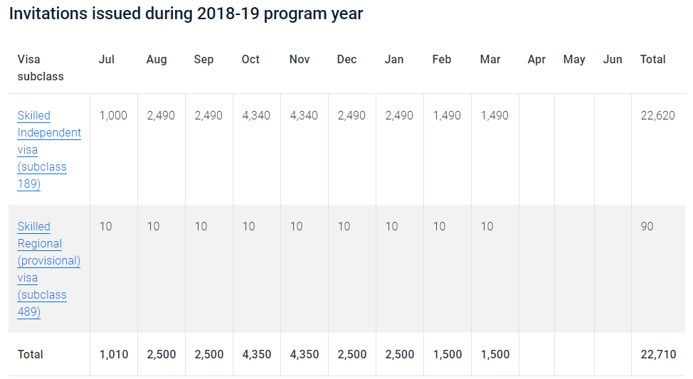 2018-19年度截至本轮:189独立技术移民共邀请了22620人;489偏远地区亲属担保共邀请90人。