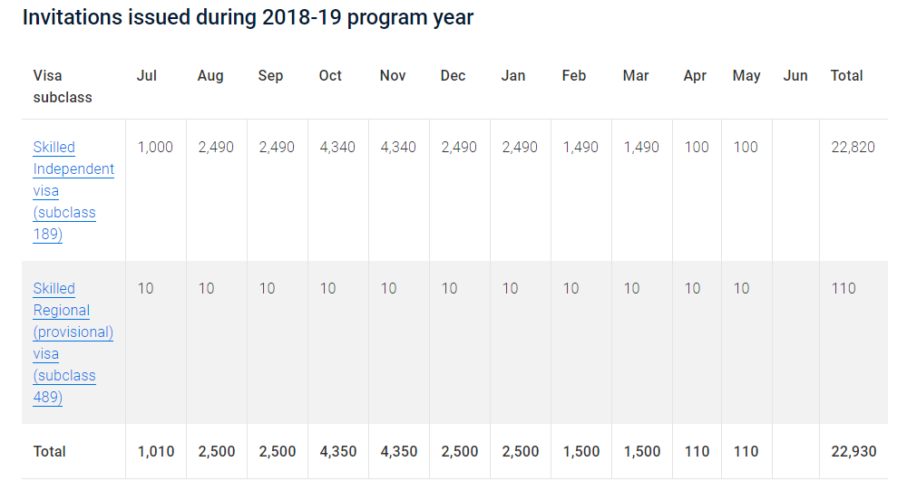 2018-19年度截至本轮:189独立技术移民共邀请了22820人;489偏远地区亲属担保共邀请100人。